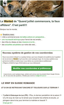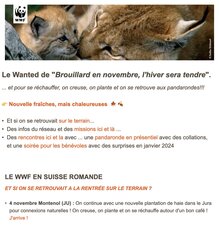 En plus des actions bénévoles sur le terrain, nous transmettrons plus d'informations et actualités romandes du WWF Ouest et de ses partenaires. Afin de s'adapter aux nouvelles normes, vous pouvez maintenant gérer vous-même vos coordonnées et préférences.