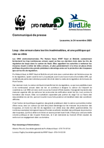 Les ONG environnementales Pro Natura Vaud, WWF Vaud et BirdLife condamnent fermement les trop nombreuses erreurs ayant eu lieu ces derniers mois dans les tirs de régulation de loups dans le canton de Vaud.