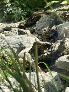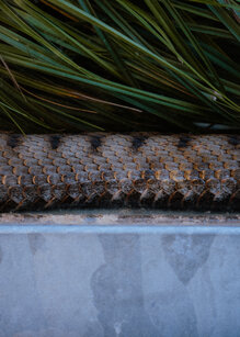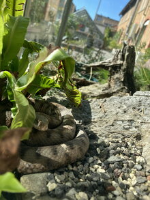 Metall, Gras, Schuppenhaut. Drei Schichten, dazwischen die Schlange. Eingepasst in die Natur, abgesetzt vom künstlichen Käfig.