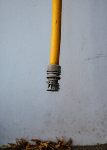 Ein gelber Schlauch hängt in der Luft. Nichts fliesst, kein Tropfen ist zu sehen. Und doch verweist er auf das, was fehlt: auf Wasser, auf Bewegung, auf etwas, das Leben weiterträgt – Tropfen für Tropfen.