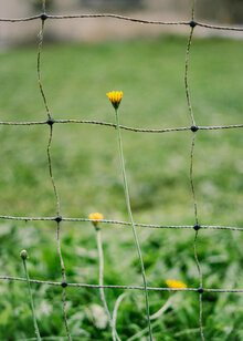 Une trace: la nature qui s’invite dans la ville, fragile mais persistante, comme une fleur traversant une fine clôture métallique.