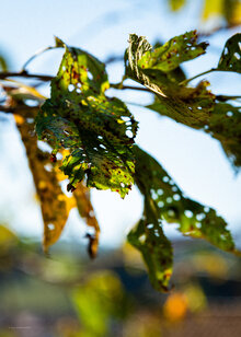 Une goutte, fragile et discrète sous sa coquille, se croit semblable aux autres. Plus loin, la lumière dessine un jeu d’ombres et de feuillages, un camouflage naturel où la vie se cache et se protège. Et puis viennent les feuilles, marquées, trouées, décolorées, aux traces visibles du temps qui passe.