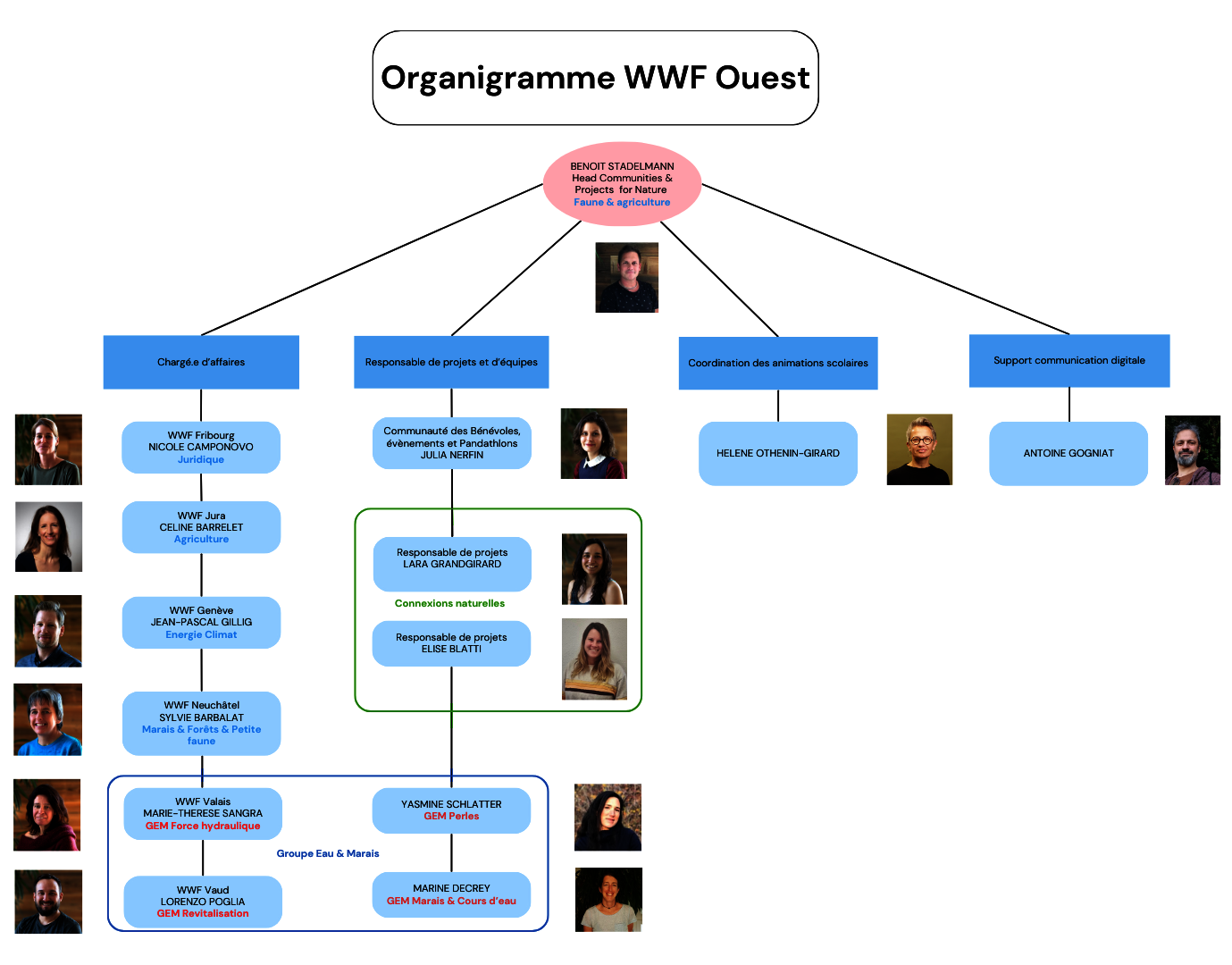 Le WWF Ouest est constitué des 6 sections cantonales romandes: Genève - Jura - Fribourg - Neuchâtel - Valais romand - Vaud, et de responsables et de chargé·e·s de projets.